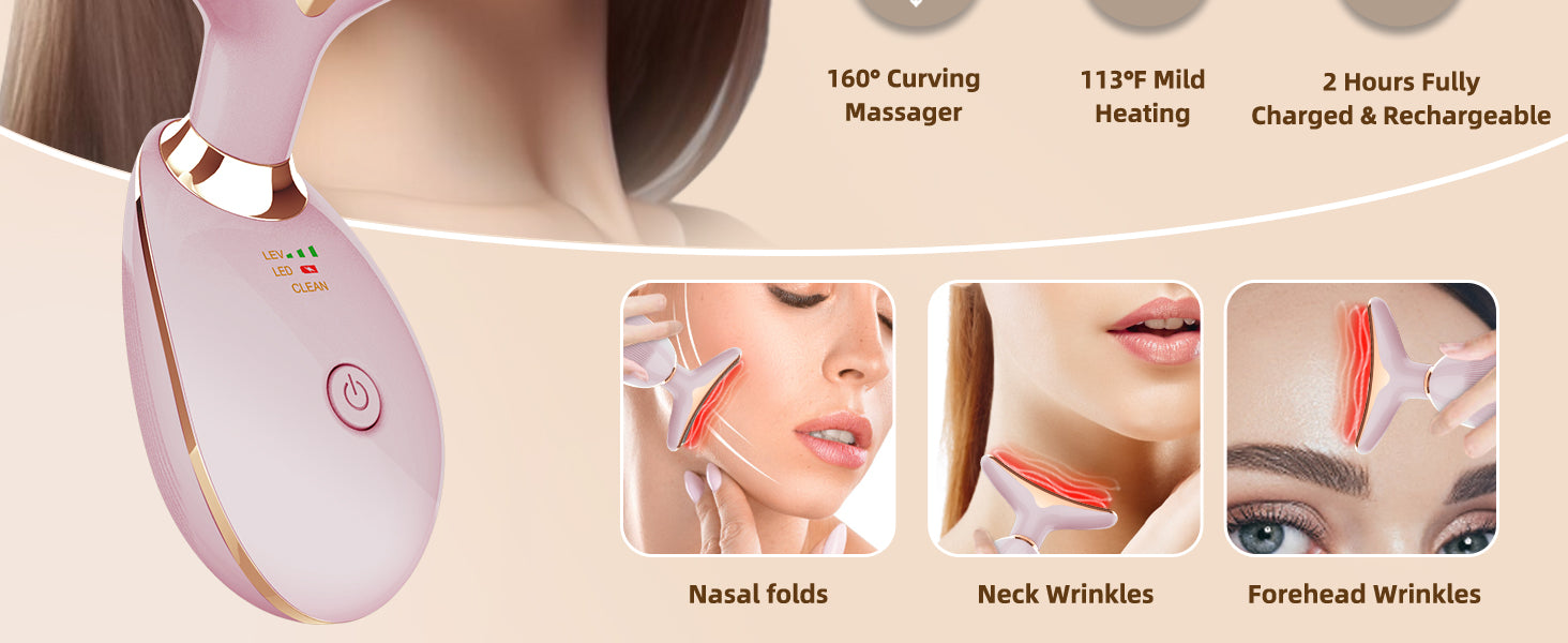 - 7 Color Face Light Therapy - Our face massager tool for face and neck is not just a skin care tool but a double chin reducer. The uniquely 160°curving massager fits well and glides smoothly on your skin, helping to achieve a lifted, youthful look and firmer facial contours