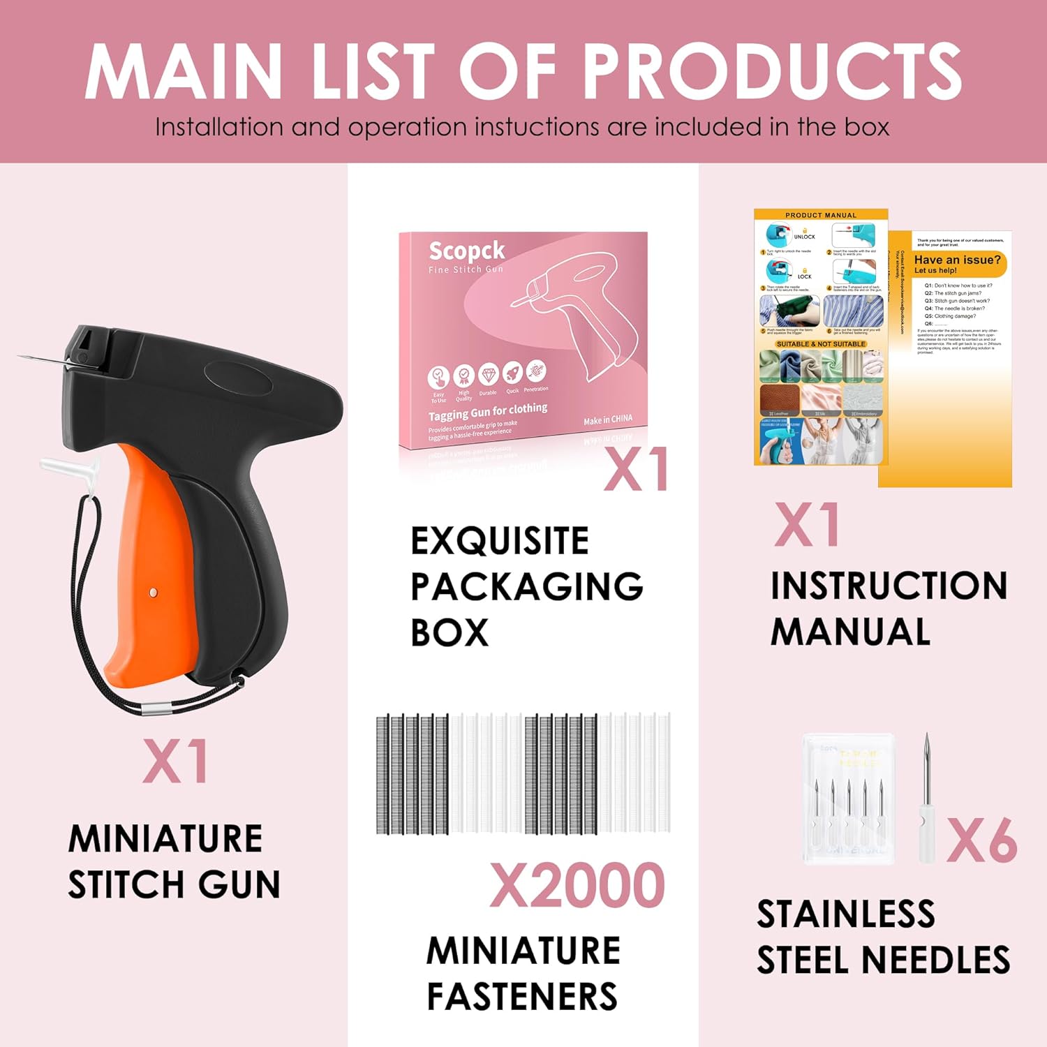 Package Included: This set includes 1 Instruction Manual, 1 stitch gun with 6 stainless steel pins, 1000 black fasteners, and 1000 white fasteners. The fasteners are 5mm in size, ensuring you won't need to purchase more anytime soon. Please note that the package contains sharp needles and children should use it under adult supervision for safety reasons